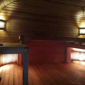 Здесь царит уникальная атмосфера умиротворения, которая позволит максимально погрузиться в мир релакса и приятных ощущений. Баня имеет совершенно особенный стиль и свой оригинальный дизайн. Фактурная древесина и естественная грубость выгодно сочетается с удобной мягкой мебелью и интересными деталями интерьера. В уютном пространстве созданы все условия для комфортного отдыха после парной: мягкие подушки, обширный стол для компании, стереосистема, спутниковое TV, интернет.